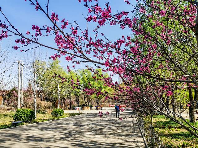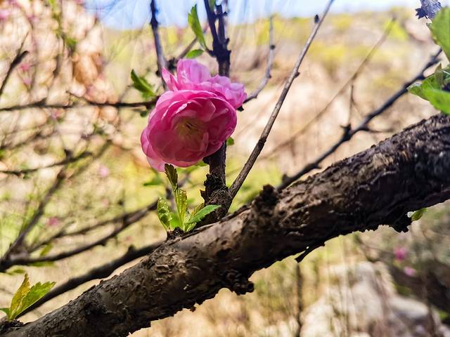 通往鱼谷洞的道路旁边桃花正绽放,嫩绿的树叶也正发芽,一片春意盎然