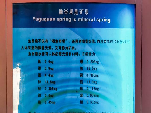鱼谷洞的矿泉水清凉甘甜,口味好,清洁度高,无味无菌,温度适中,流量稳定,有害元素极少,经化验分析,全部符合卫生标准,14种微量元素全部在安全范围内,符合国家饮用水标准。其总硬度171mg/l,钙质59.3ppm,对降低心脏病发病率有利;含有硒,有防止心脏病和掏癌细胞生长的作用;含有锌,对慢性病复康有益;此外还含有钠。与国内外矿泉水比较,质量是相当高的。