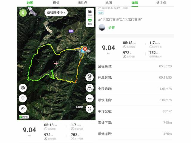 龙门天关环形穿越,全长9.04公里,用时5小时30分钟,有队员走的比较慢,所以比正常用时慢了约1小时。