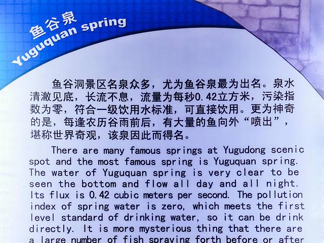 其南侧的鱼谷洞泉甘冽清凉,长年涌水不息,水中富含有多种有益于人体的矿物质微量元素,是难得的天然矿泉水。每逢农历谷雨前后,泉洞就会不断的向外喷鱼,成为千古之谜。该泉成为世界“八大怪泉”之一,被列为世界奇闻。