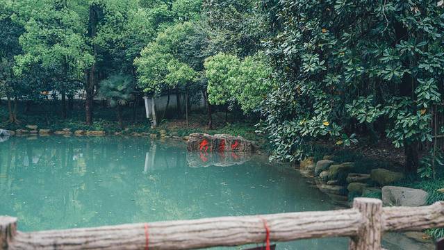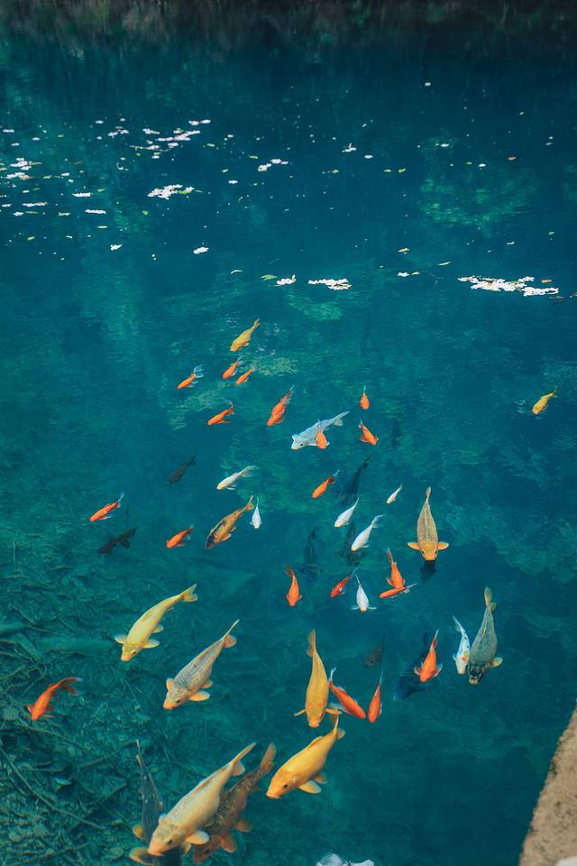 蓝色发绿的那种纯净 锦鲤在里面欢乐的游戏 顺流而上。