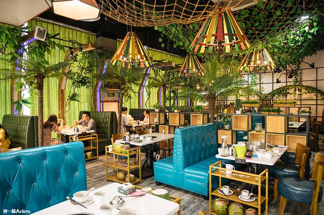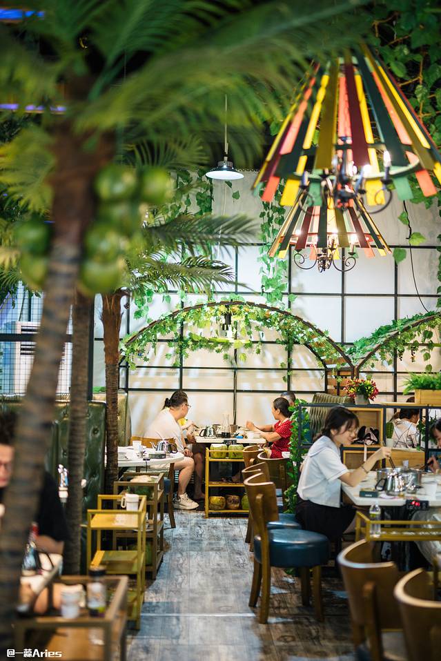 进入餐厅,映入眼帘的是满目的绿色植物装饰,一秒带入热带雨林的氛围中,和窗外正午的炎热形成了鲜明的对比。