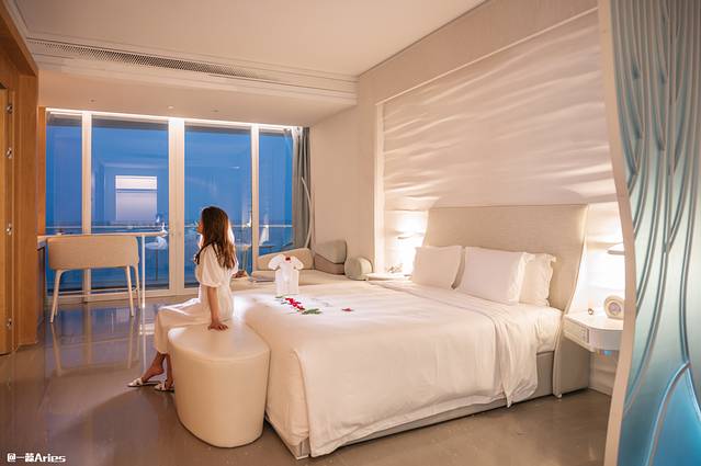 推开房门的时候也被惊艳到了,房间以典雅的灰色、米色为主色调,简约时尚;房间面积也超大,88平的180度豪华海景,一眼就能望见不远处的蜈支洲岛。
