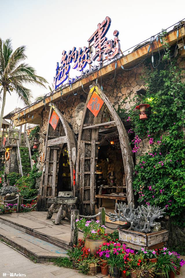 萌哒哒椰子鸡的回味实在太足了,离开前我们又去了三亚湾的分店。如果说情人桥店是热带雨林风,那这里便是满屏的"海岛风"。
