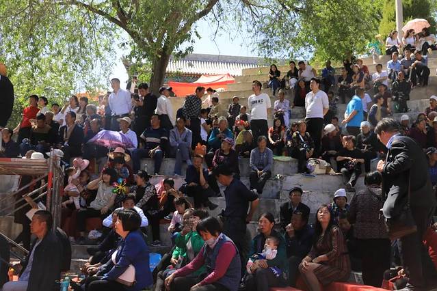 戏台下,人们不顾烈日的暴晒,围坐在一起如痴如醉地欣赏剧目。
