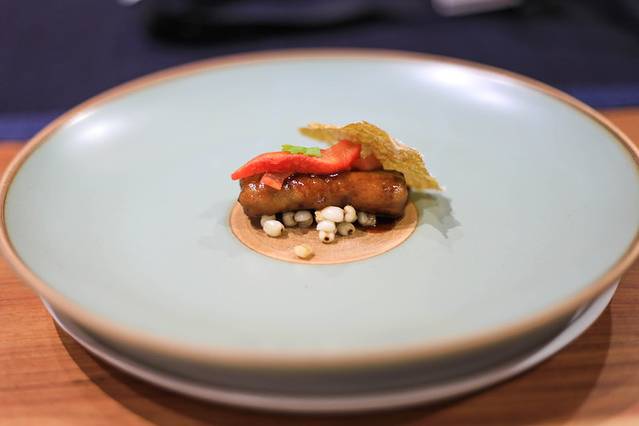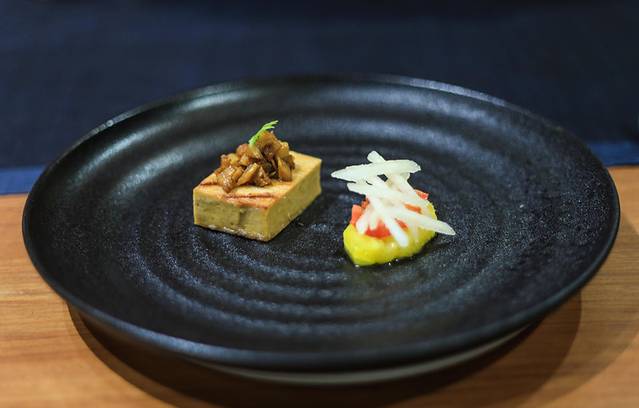 素鹅肝酱用腰果、鸭蛋黄、茄子作为原料,把有食材放在一起用手持粉碎机打碎制做而成,还凤梨和冬笋丁草莓、苹果丝做配菜,做出来的味道像极了鹅肝!