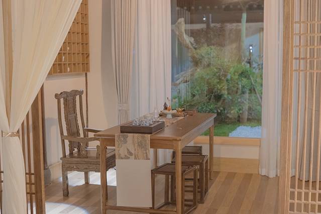 餐厅内的原木色装修风格别致素雅,颇具禅意,仿佛在一步一景中回归自然的环境!
