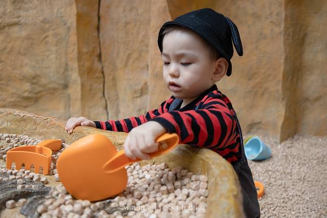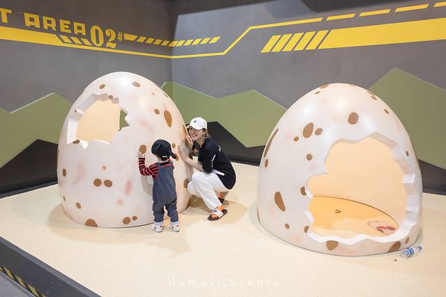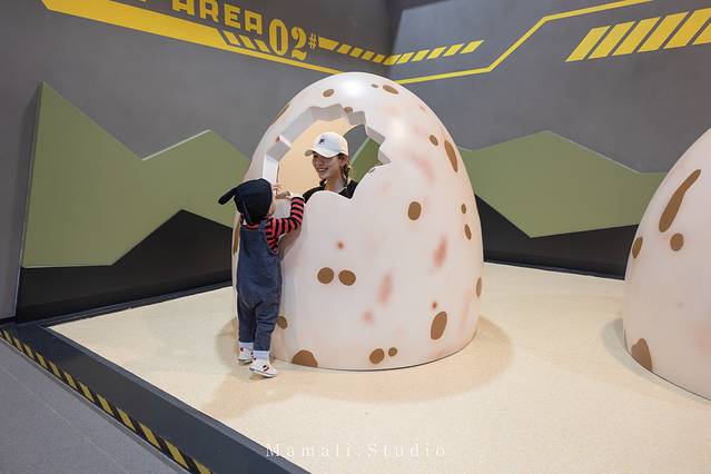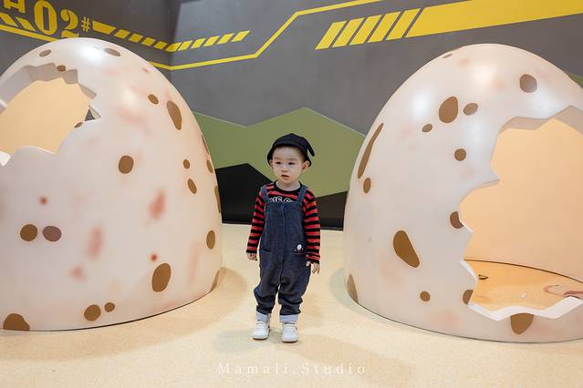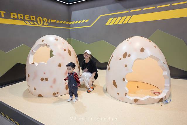 KK对巨大的恐龙蛋充满好奇。在蛋壳里跑来跑去,还拉着我一起玩,特别开心。