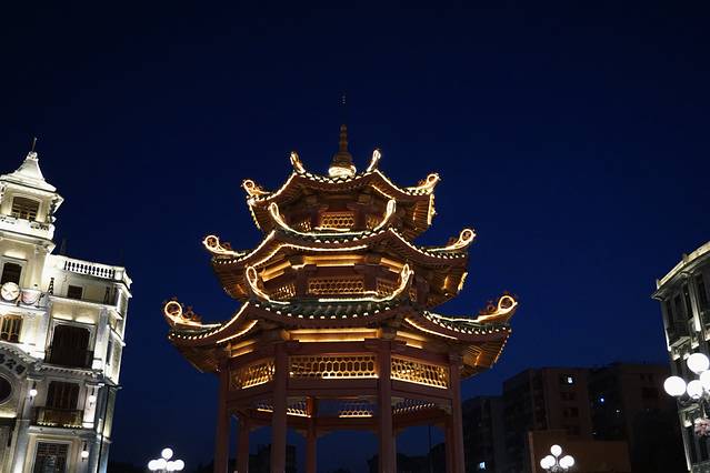 夜晚的中山纪念亭和百货大楼都亮起了灯。