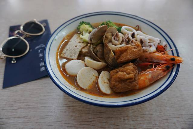 找了家评价不错的黄记海鲜沙嗲面,配上满满一盆水果。