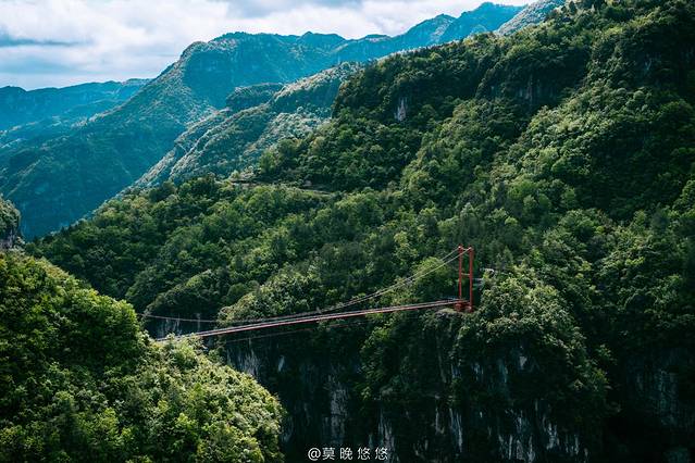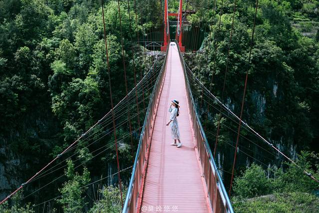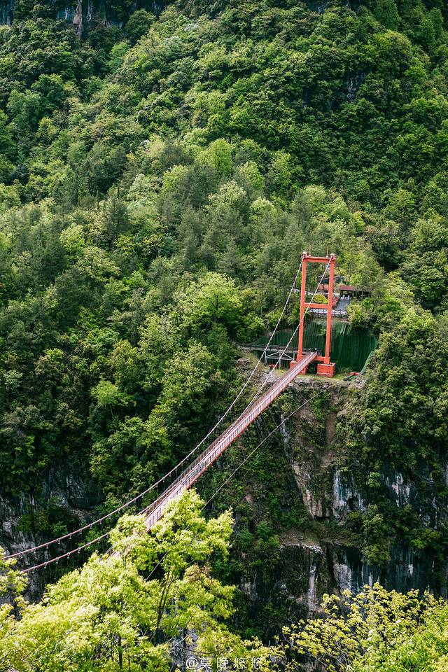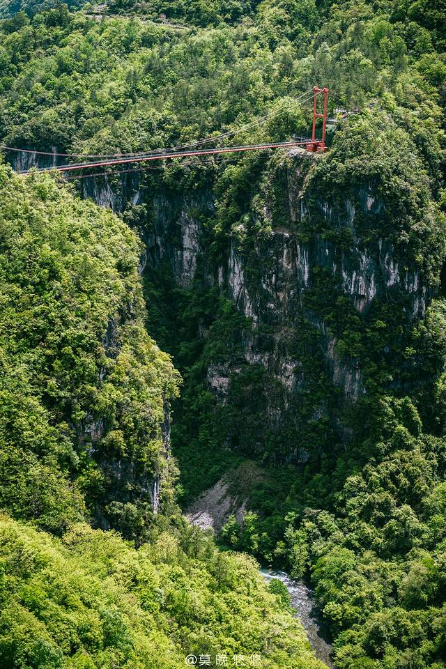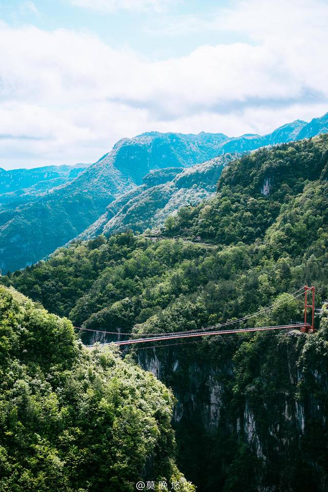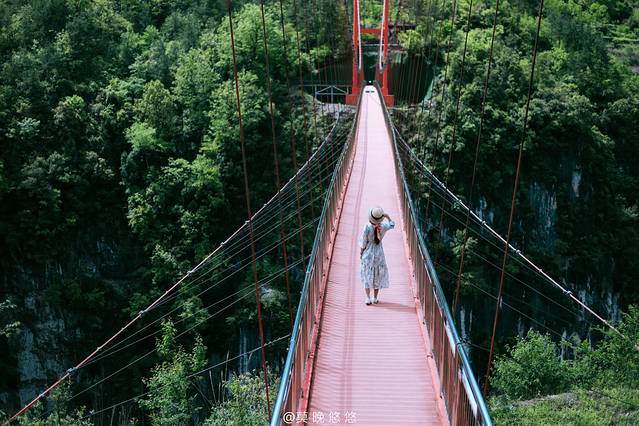一道明丽的红桥横跨深邃的峡谷,矗立在险峻巍峨的峭壁上,与四周青山绿树相得益彰,绝妙的万绿从中一点红,非常吸睛。这道人行索桥全长220米,高230米,中间设置了12米的玻璃栈道,站在上面像是悬浮在峡谷间,惊险刺激。
