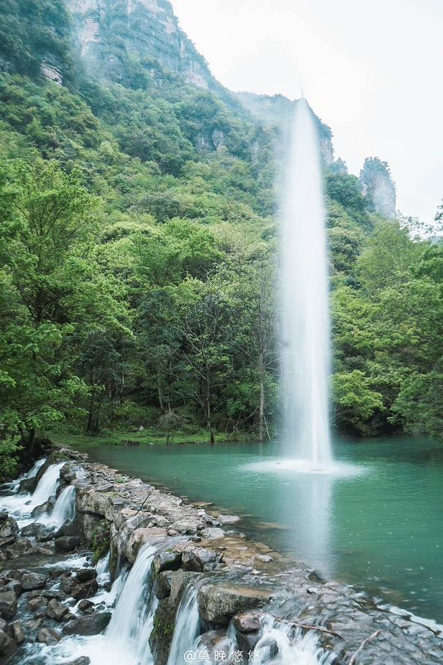 一路溯游而上,邂逅一潭春水。碧绿的潭水中一道喷泉直冲天际,水花哗哗落下,荡起粼粼波光。