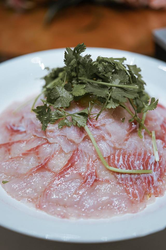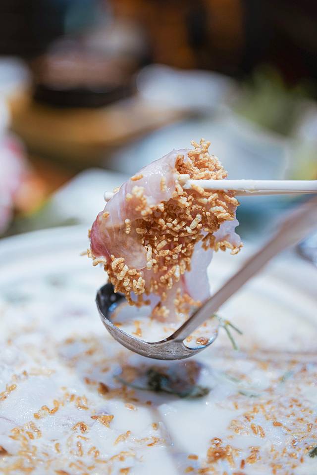 薄切的生鱼片,跟顺德的鱼生有得一比,只不过这道菜并不是生吃的。而是放进滚烫的高汤里煮~