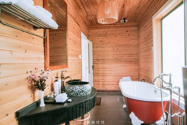 铜制的水龙头,复古印花的洗手盘,通通彰显着别墅的格调与品位。听着山林啾啾鸟鸣,安静地泡个热水澡,最能消除身心疲惫和烦恼。