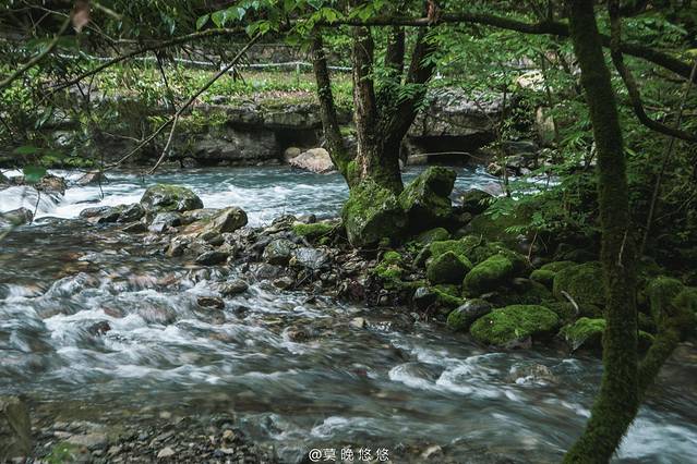 清澈的溪涧穿梭在茂密的山林中,滔滔不绝地奔流而下,潺潺水声清脆欢快,人的心情也畅快起来。滚滚流水顺着山势而下,陡峭狭窄的地方湍急澎湃,平坦宽阔的水段缓缓流淌。