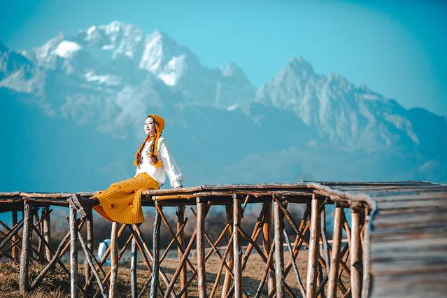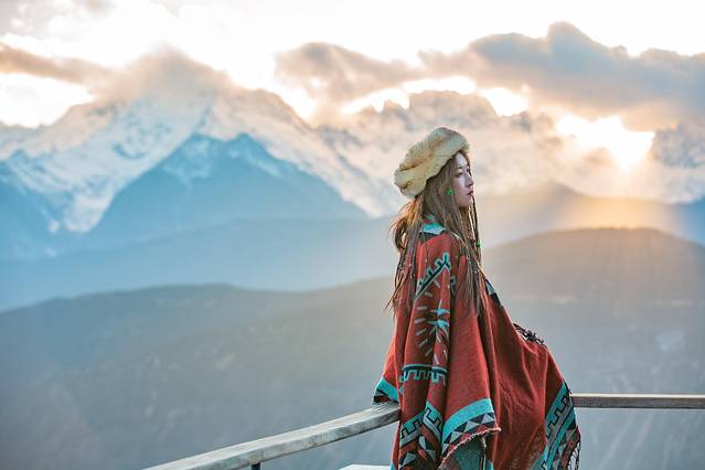 在温暖的玻璃房内观看日出,而不需要在零下十几度的室外等候,已经成为不少游客选择高端民宿的首选项,浓雾顶就有几家不错的高端网红民宿。顶层露台通常是观看雪山位置最好的地点,露台正对雪山十三峰一览无遗,前景是炊烟袅袅的村落,一副山居图景象。