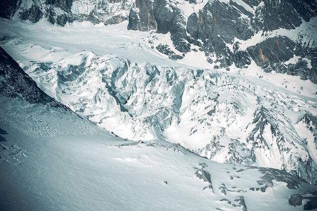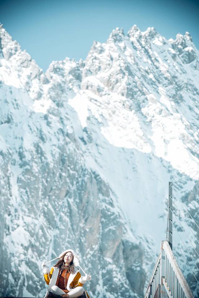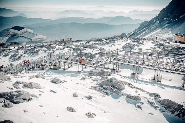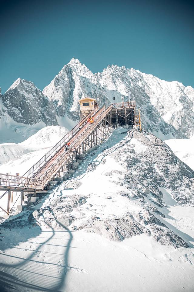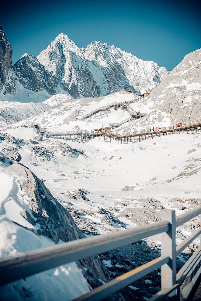 雪山可以乘坐大索道到观景平台,再登栈道至最高点,4680米。