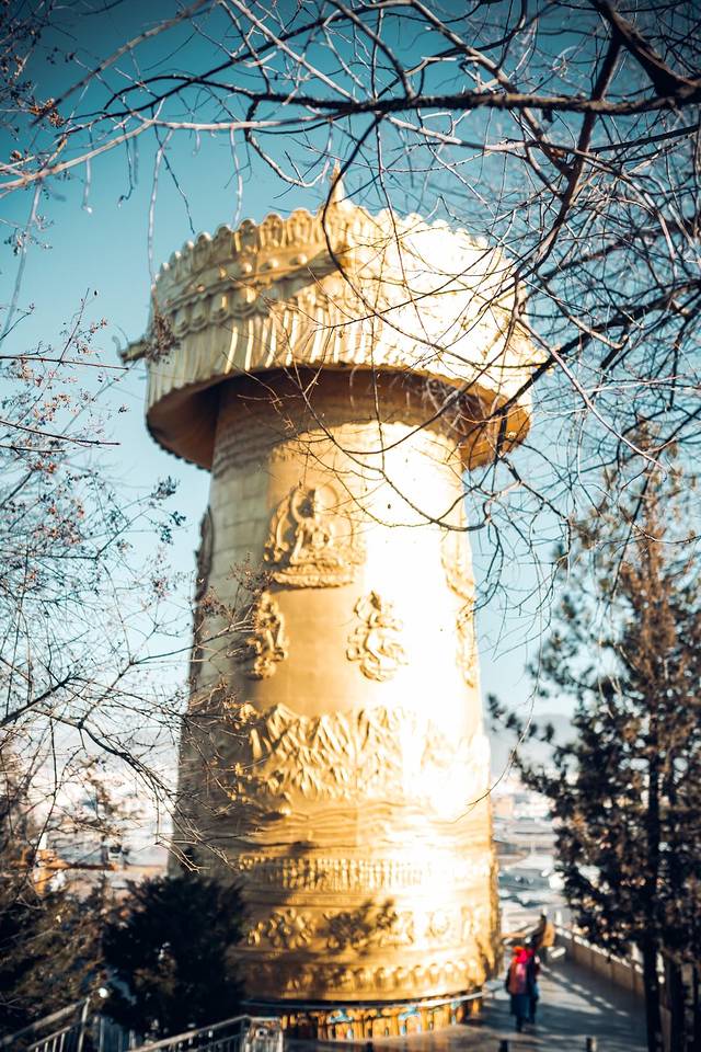 这里也是世界最大的转经筒所在地。这个转经筒高21米,重60吨,是世界上最大最重的镏金纯铜转经筒,筒内藏有经咒,无字真言124万条和多种佛宝16吨。需要6个以上成年男子同时用力才能将其转动。