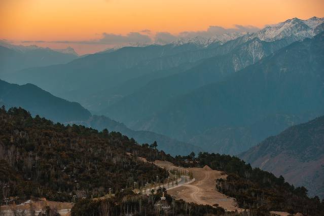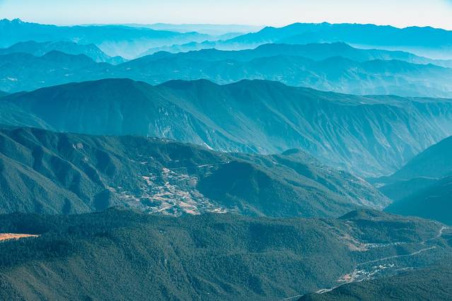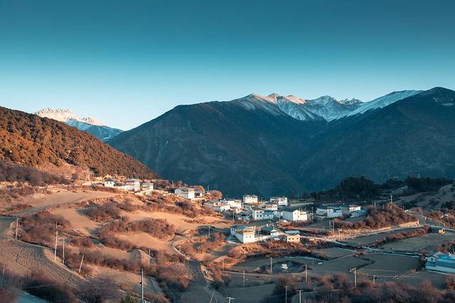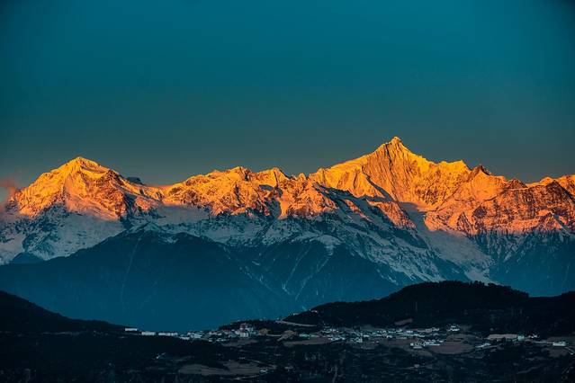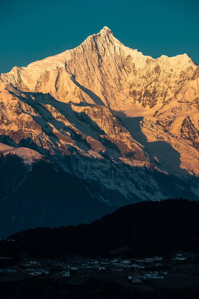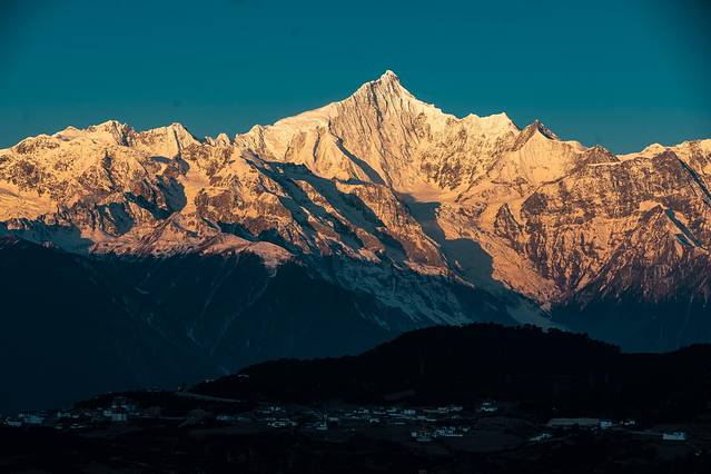 这里虽然距离梅里雪山远一些,但可以同时看见梅里雪山十三峰全景,并且以飞来寺附近的村落作为前景,画面更加饱满。如果想要拍摄全景,更推荐浓雾顶观景台。