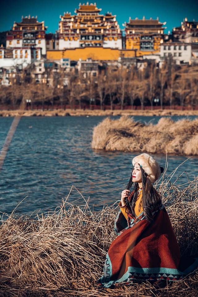 寺庙前面有一块很大的湿地湖泊,天气晴朗时,水清如镜,湖山相映。如果天气许可,这里是正对松赞林寺的非常好的拍摄地。