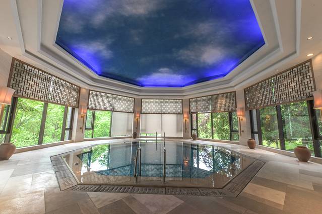武夷山大红袍山庄的室内泳池颇具特色,分为大泳池与小泳池,在水池里静坐都能欣赏外面绿水青山的风光,是不是很赞?室内环境优雅、采光好,水池与空间颇具建筑学的艺术美,深受人们喜欢。