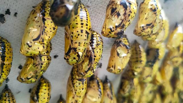 在蝴蝶谷,拍摄蝴蝶化蛹成蝶是一件有意思的事情,同时也是一件漫长的过程。如果你来的恰好到时机,会看到蝴蝶从蛹中孵化出来;如果时间不凑巧,可能看到的只是挂在一起的一只只奇形怪状的虫蛹。当然,你喜欢蝴蝶,还可以带走。因为这里有蝴蝶标本出售。