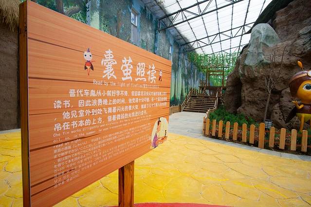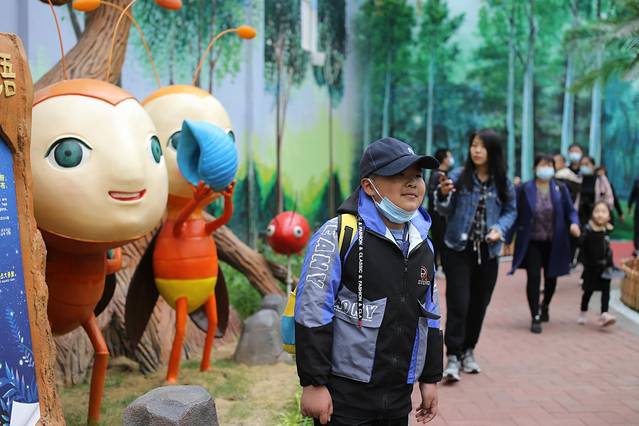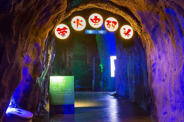 进入景区,沿着一段竹林茂盛的小径往里走,进入萤语谷。整个线路是环形设计,不走回头路,所以一定要跟上步伐,尤其是孩子们。萤语谷里面是景区的吉祥物展示,也就是萤火虫的巨型卡通造像,孩子们看到会非常的喜欢。我们要从巨大的萤火虫口中进入萤梦之域。绕过巨大的蛋之后,可以登上景区观光车,前往蝴蝶谷。