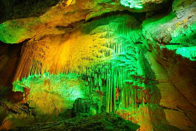 这些石钟乳、石笋等景观,在灯光的映射下,变的美轮美奂。而由它们形成的某些景观,还有着一个个有意思的名字,如“万年灵芝”、“松山冰雪”之类的。这些都是在亿万年的时间积累中,慢慢形成的。其中,有处类似牛百叶的冰晶石,其中有个上下4厘米的断口,专家说这处断口再次融合,至少需要200年。