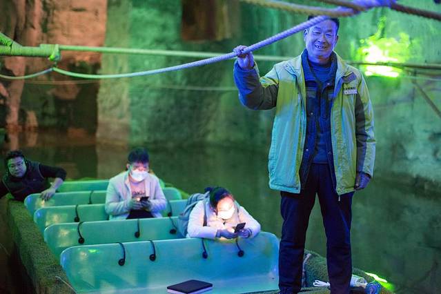 一直往里走,直到遇到渡船码头,我们的探索行程才算刚刚开始。在幽暗中小心翼翼的坐在船上,等候掌船大叔,扶绳驾驶,缓缓的没入黑暗当中。在黑暗洞中,伸手不见五指,只有哗啦哗啦的水声。这时讲解员就会提醒你抬头向上看……