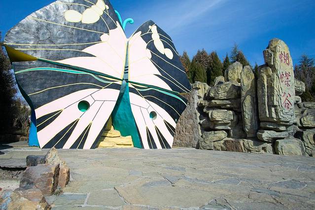 蝴蝶谷的门口设计是一只巨大的蝴蝶展翅,在经过一段徒步跋涉后,即可看到。 蝴蝶谷是我国江北特大的生态蝴蝶培育基地,背湖依山自然形成,热带植被丰富,中间谷底贯穿一条溪流,自然生活着成千上万只色彩艳丽的蝴蝶,有丝带凤蝶、枯叶蝶、麝香凤蝶等世界著名种类多达50余种,园内的小桥、流水、幽谷、鲜花、翩翩起舞的彩蝶以及各类粗犷的原始植被,构成了一个幽静、自然的世外桃源。