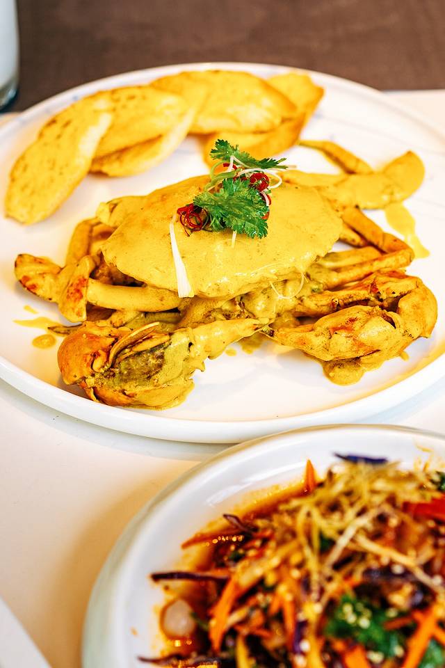 海南 咸蛋黄炒蟹:主推的就是螃蟹🦀,有四种口味咖喱,香辣,黑胡椒,不过为了尝鲜,特意点了个咸蛋黄,少倾,一只挂满姜黄色调料的巨蟹粉墨登场,不像其他口味汁水满盘,这道咸蛋黄口味呈半凝固的状态,将所有味道如盔甲状挂满蟹身,可以充分享受浓郁带来的味蕾享受,而且肉质非常肥美丰腴。