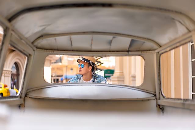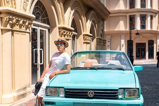 欧陆小镇一样的街景,本身就很漂亮,里面还有很多适合拍照的道具, 比如 伦敦 常见的红色电话亭, 古巴 常见的蓝色复古老爷车……。