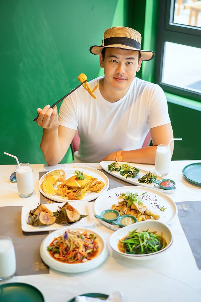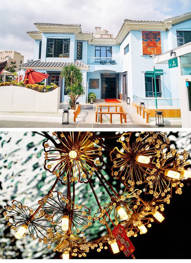 餐厅外面是蓝色的建筑,非常典雅;其内部一下切换成了莫兰迪绿,满满的高级感,而且让人联想到热带的绿意盎然。