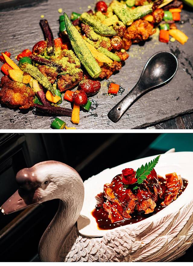 网红秋葵花椒骨:秋葵还有排骨都被炸制的极其酥脆,搭配着黑色石质托盘上来,凸显十足的网红气质。