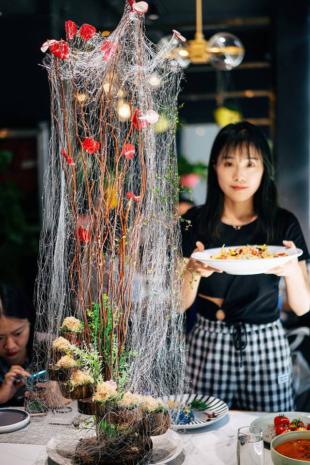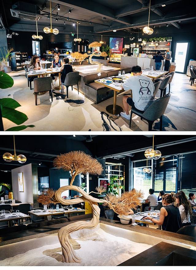 它整体是灰色调的 北欧 冷淡风,但在餐具的选择上又跳脱的鲜艳,这种色彩反差,在营造环境高级感的同时赋予了菜品极强张力。餐厅中央有一颗金色小树,亦点缀出不凡的生命活力。
