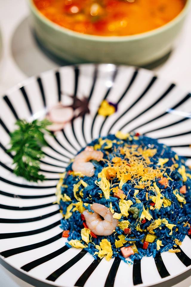 蓝色海洋炒饭:米饭界的颜值担当,据说是蓝色可食用花瓣混煮的童话色彩,如同大海一样让人神往,有点舍不得又迫切想吃掉它。