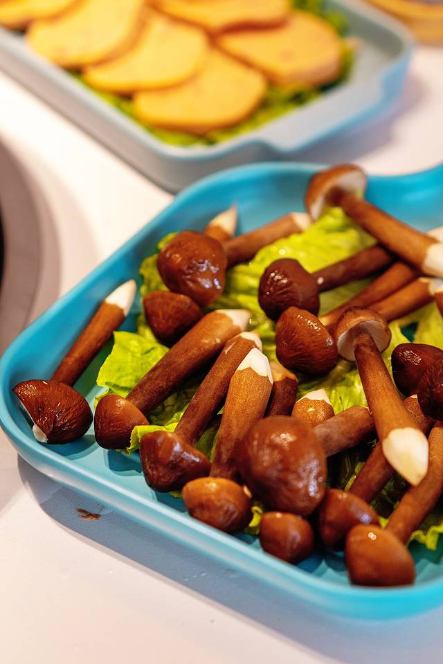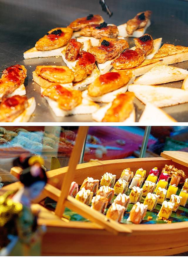 喜欢吃日料的小伙伴也有福了,在这里,三文鱼刺身、蓝鳍金枪鱼、甜虾刺身、 北极 贝刺身等日式鱼生摆的琳琅满目;寿司、手卷种类也非常多样。除此还有各种各样的菌菇蔬菜。