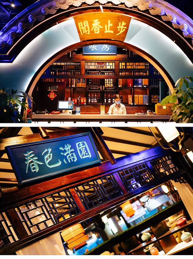 它有着清秀的中式门脸,圆形苏式拱门,木质蓝色窗栅,古色古香的木质餐桌、雕花瓷瓶,再搭配上绿植和红灯笼,有种进入园林的感觉,典雅娟秀的气质扑面而来。