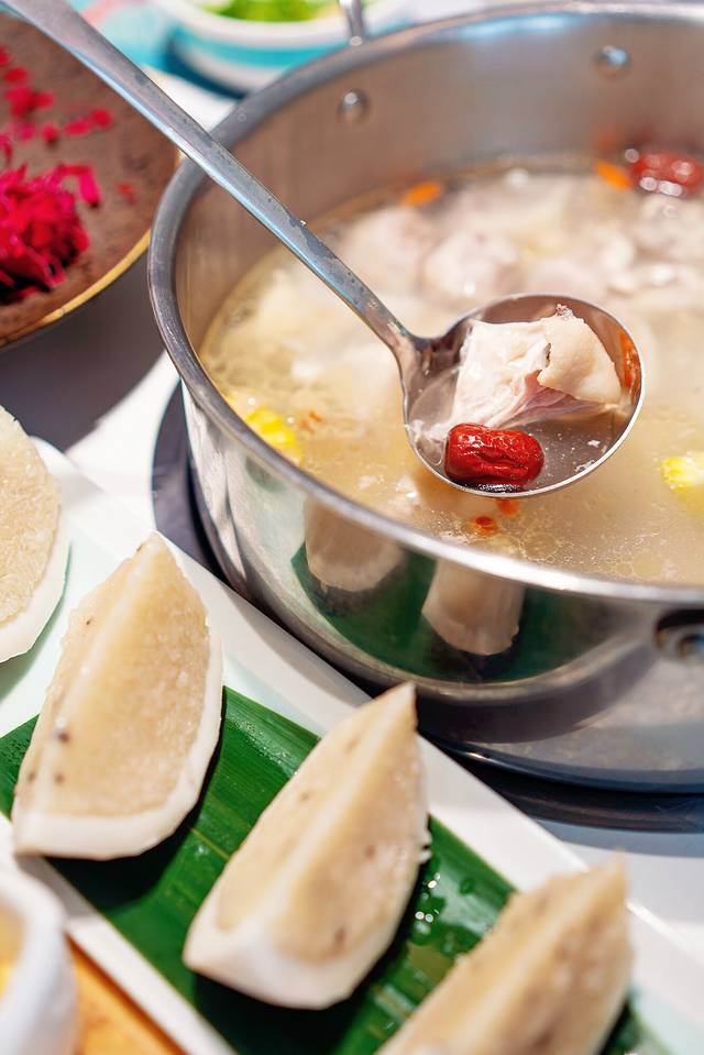 原味椰子鸡:这是最传统的汤底,选用三个 海南 椰子,加天然矿泉水调制而成,并配有枸杞、红枣、姜片、椰肉等辅料来增添风味。它们拥着鲜美的鸡肉一起入浴,只需三分钟,便能滋润出最清甜的味道。很多人问我蘸的料汁怎么调:小青柑+小米辣+酱油+沙姜,比例可按个人口味微调,保证绝味!