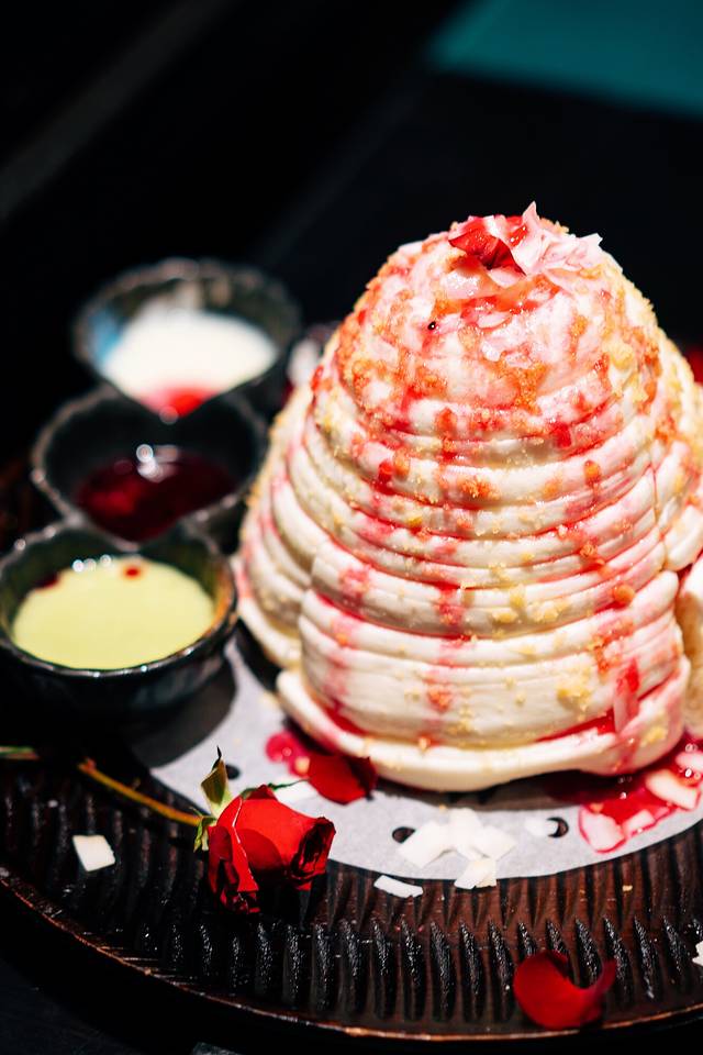 网红爆品椰香花卷:外边看起来超像冰淇淋,看别人上手掰的时候,着实惊到一下!口感非常像奶香味的面包,搭配3种蘸料:牛油果汁、炼乳与牛油果酱,每一种都好吃。很有仪式感的一道菜,因为服务人员会念念有词的,让你自己把干玫瑰花拍碎撒在花卷上。