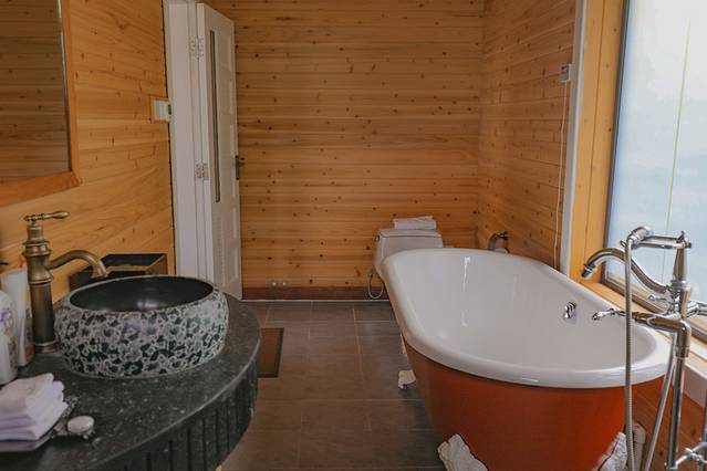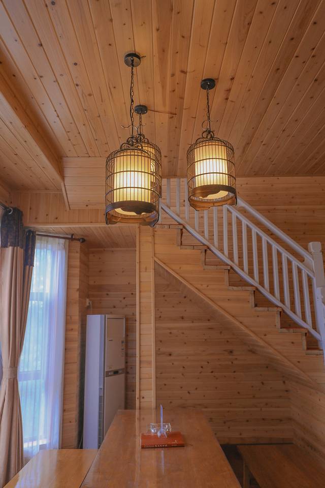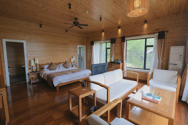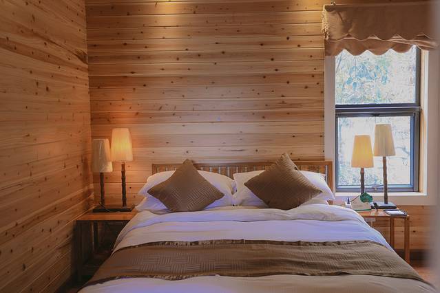 简约质感的实木家具,虽不豪华,但住起来非常的舒适,凸显着木屋的原生态度假风。楼下的大床房,情侣住起来也十分的方便,除了大床房,也配有标间。