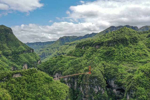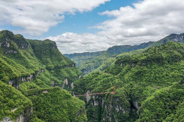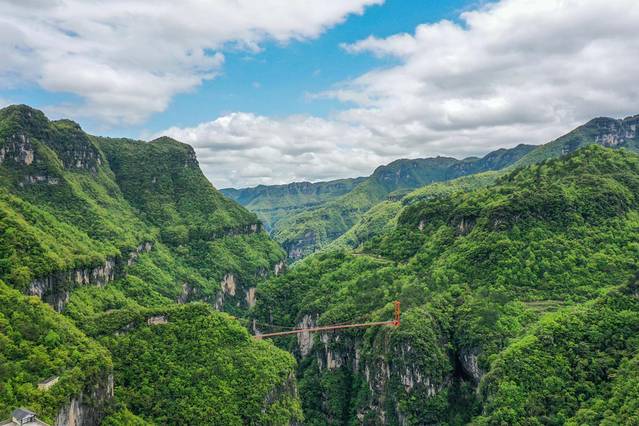 深入巍峨的山峰间,站在悬崖索桥上,仿佛立于深钩峡谷的中央,无论是高耸入云的绝壁还是茂密的林海,此刻都在我的脚下,远处重重叠叠的山峰,青得像透明的水晶,可又不那么沉静,更像是一道道天然屏障,绵延不绝。