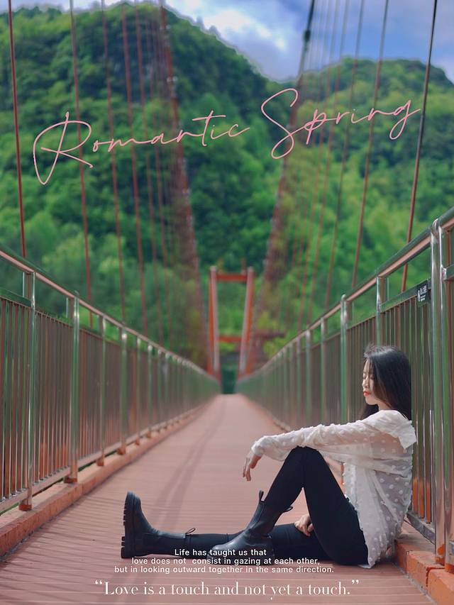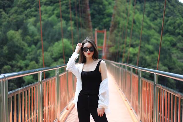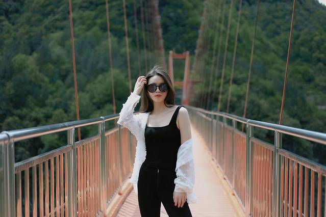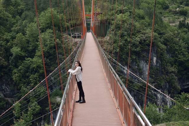 人行索桥长220米,高230米,中间有12米玻璃体验区。索桥的两头,是连接一个村落的重要交通路线,中间一道险谷,索桥下面就是霸王河与战口河汇合处。桥面山风习习,桥身似晃非晃,那体验感绝对飘飘欲仙。在桥中心的玻璃桥面可看到桥下潺潺的溪水,一边是清风过耳,一边是提心吊胆,一半是秀色可餐,一半是小心翼翼,也是颇有趣味。