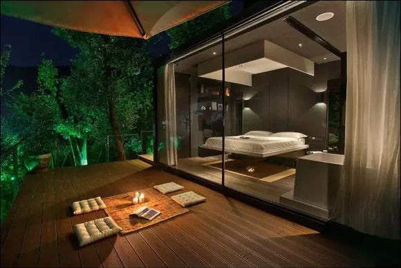 地球仓就藏在森林中,独立的小屋鳞次栉比坐落在山上林中,有着大大的一面落地窗,直接与森林面对面。