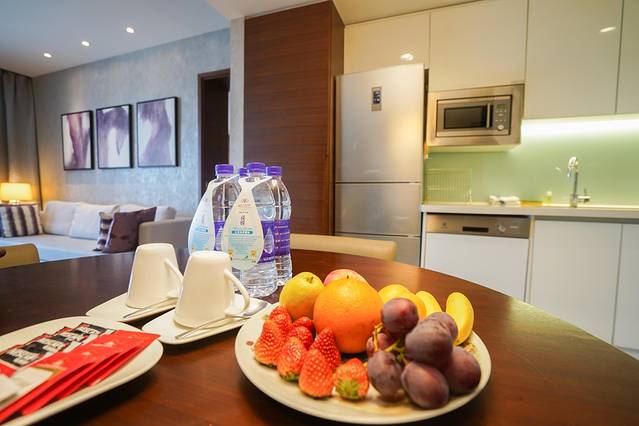 这次我入住的是两房豪华套房,选择这种户型是因为想要和家人在同一个居住空间下又拥有各自的私密空间。套房的中间区域是客厅,可以召集大家一起玩桌游,就算聚在一起吃火锅也不会觉得拥挤。刚踏进房间就看到公寓提前准备的水果和贴心的欢迎卡片,没想到在服务公寓也能享受到如此细致的服务,完全媲美五星级酒店,值得种草~