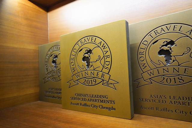 我注意到位于大堂的休息区域,成列了公寓曾获得过的很多奖项。值得一提的是从2017年至2020年,连续4年荣获Word Travel Awards世界旅游大奖颁发的“亚洲领先服务式公寓”及“中国领先服务式公寓”奖项,该奖项被誉为世界旅游行业内的奥斯卡!