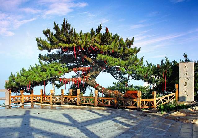 去山顶走龟蒙顶左手处的台阶路,一共有99级台阶,寓意很好。中途会看到一棵如龙头状的松树,名为卧龙松,据说有600多年的历史了。