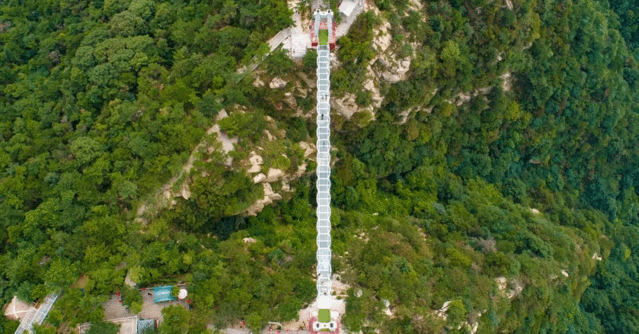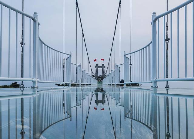 东天门出有一个5D玻璃桥30元/人,走到最中间位置的时候,腿有点发抖。蒙山5D玻璃桥,是来