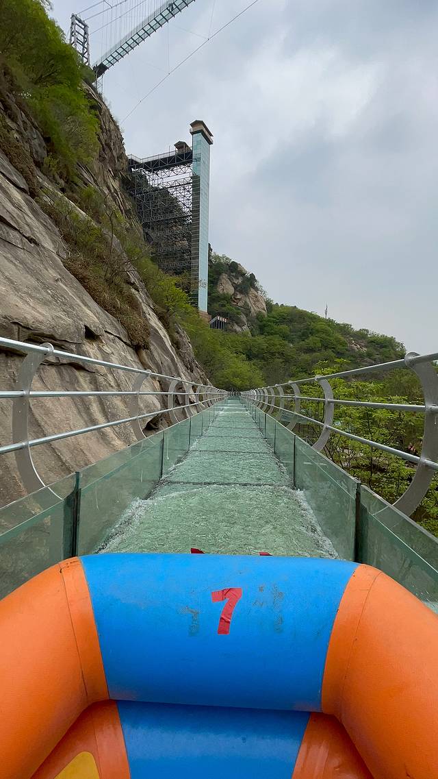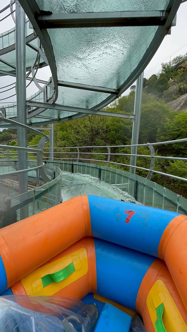 在清凉谷景区的最高峰就能看到蜿蜒的高空玻璃滑道,四周都是透明的,可以清楚的看到弯道里的水怎样推波助澜肆意挥洒。先是坐上皮划艇在上面有很多弯道,水波急促,缓轻缓急,感受连连。最后的冲刺徒坡冲进了湖里,最后就可以漂流了。也可以去下面划竹筏。