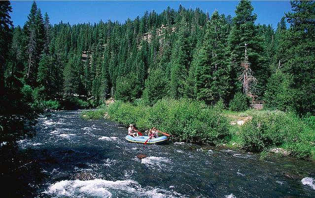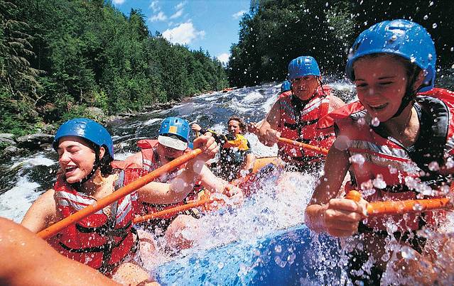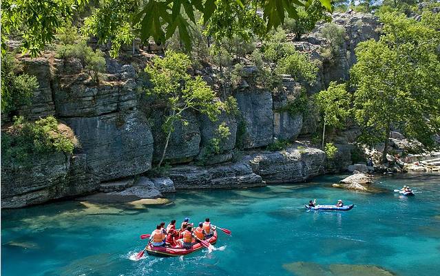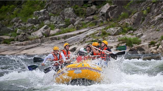 皮筏上人们身着救生衣,尖叫欢笑声溢满小船。
